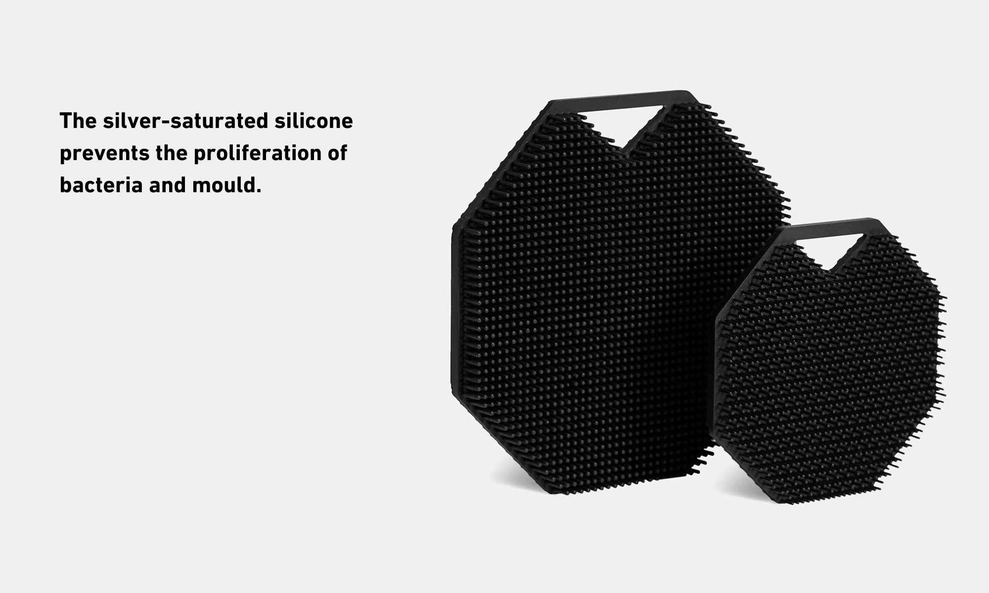 The Scrubber Duo is a duo of silicone body and face scrubbers made from 100% antibacterial food-grade silicone, which has been infused with silver to combat the growth of odour-causing bacteria and mould on its surface.